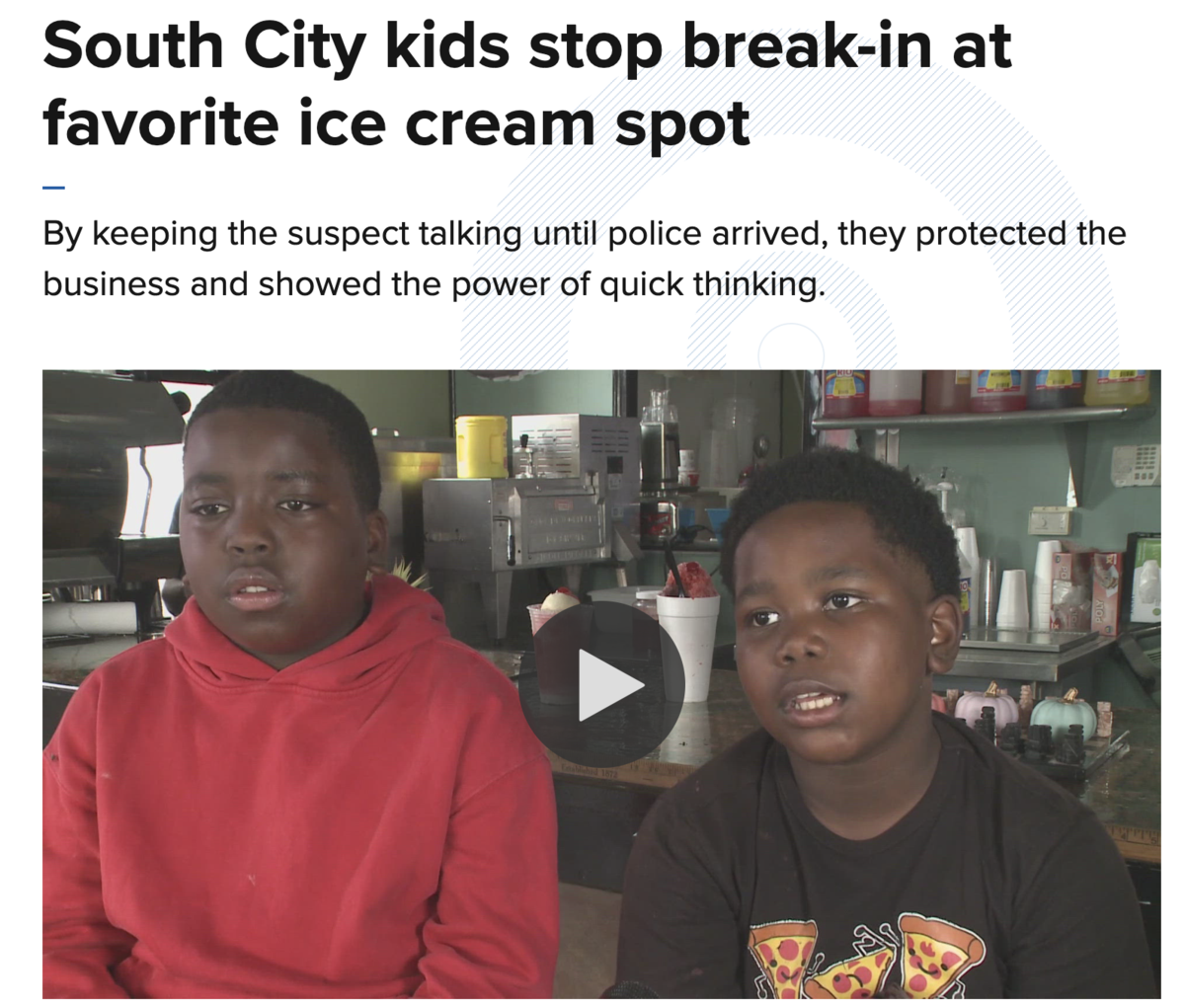 ST. LOUIS — Two elementary students from South City Academy are being celebrated as local heroes after their quick thinking helped stop a burglary at a neighborhood ice cream shop.